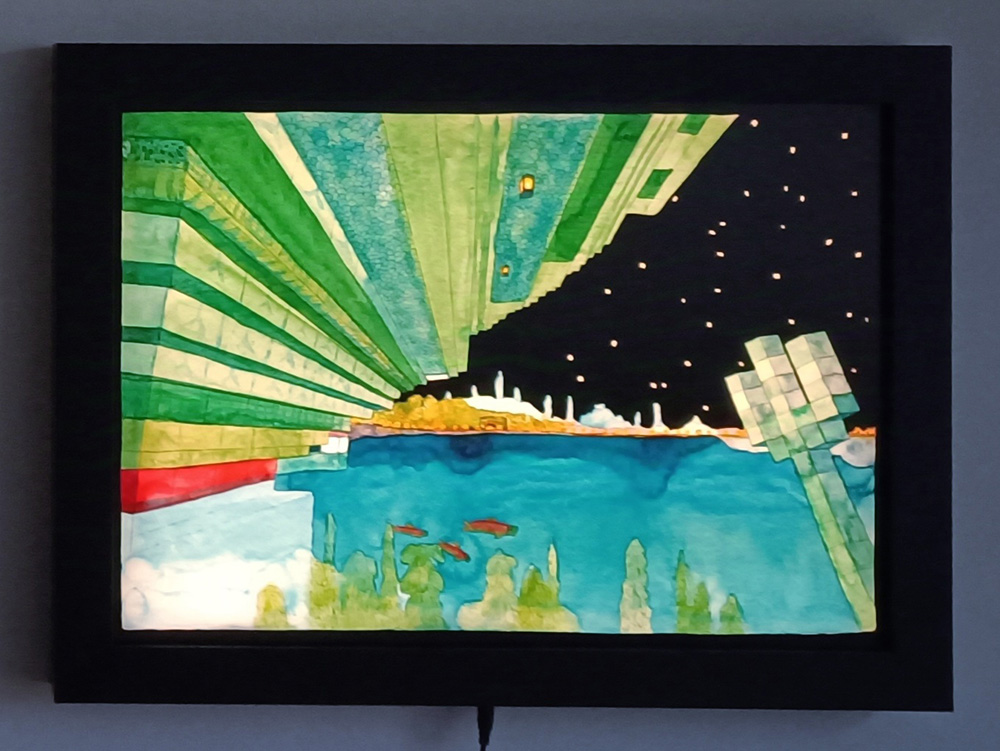Tento typ obrazu je zevnitř osazený soustavou LED žároviček s neutrální teplotou bílého světla. Intenzita jasu se dá snadno regulovat, v noci může fungovat jako lampička nebo světelný prvek interiéru. Součástí je adaptér na 12V s kabelem a vypínačem – regulátorem jasu. Za přítomnosti přirozeného denního světla v místnosti není nutné obraz rozsvěcovat, motiv je viditelný i bez zapnutého vnitřního osvětlení.