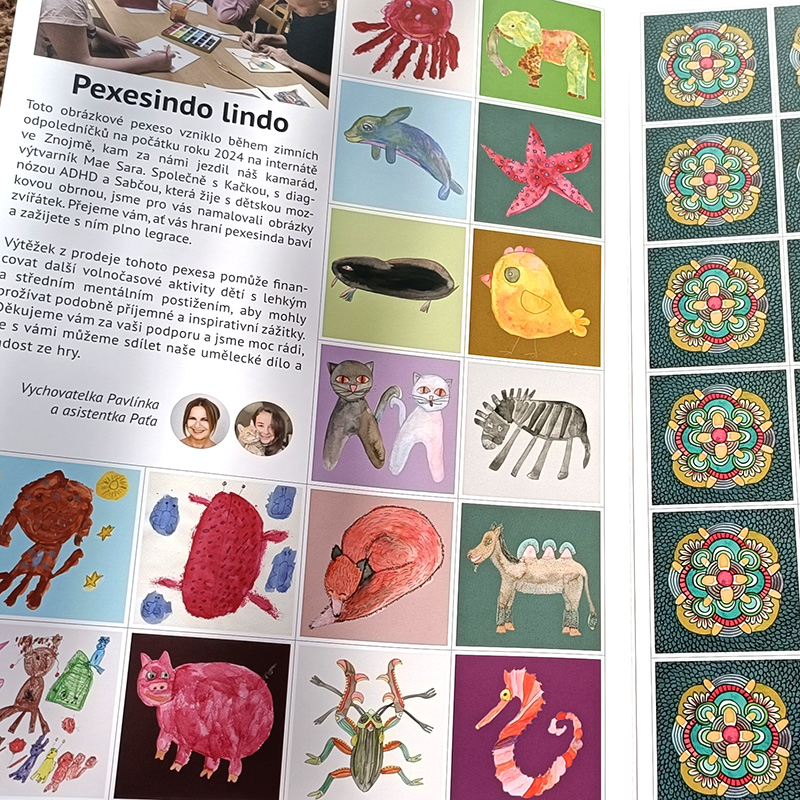 Toto obrázkové pexeso vzniklo během zimních odpoledníčků na počátku roku 2024 na internátě ve Znojmě, kam za námi jezdil náš kamarád, výtvarník Mae Sara. Společně s Kačkou, s diagnózou ADHD a Sabčou, která žije s dětskou mozkovou obrnou, jsme pro vás namalovali obrázky zvířátek. Přejeme vám, ať vás hraní pexesinda baví a zažijete s ním plno legrace.