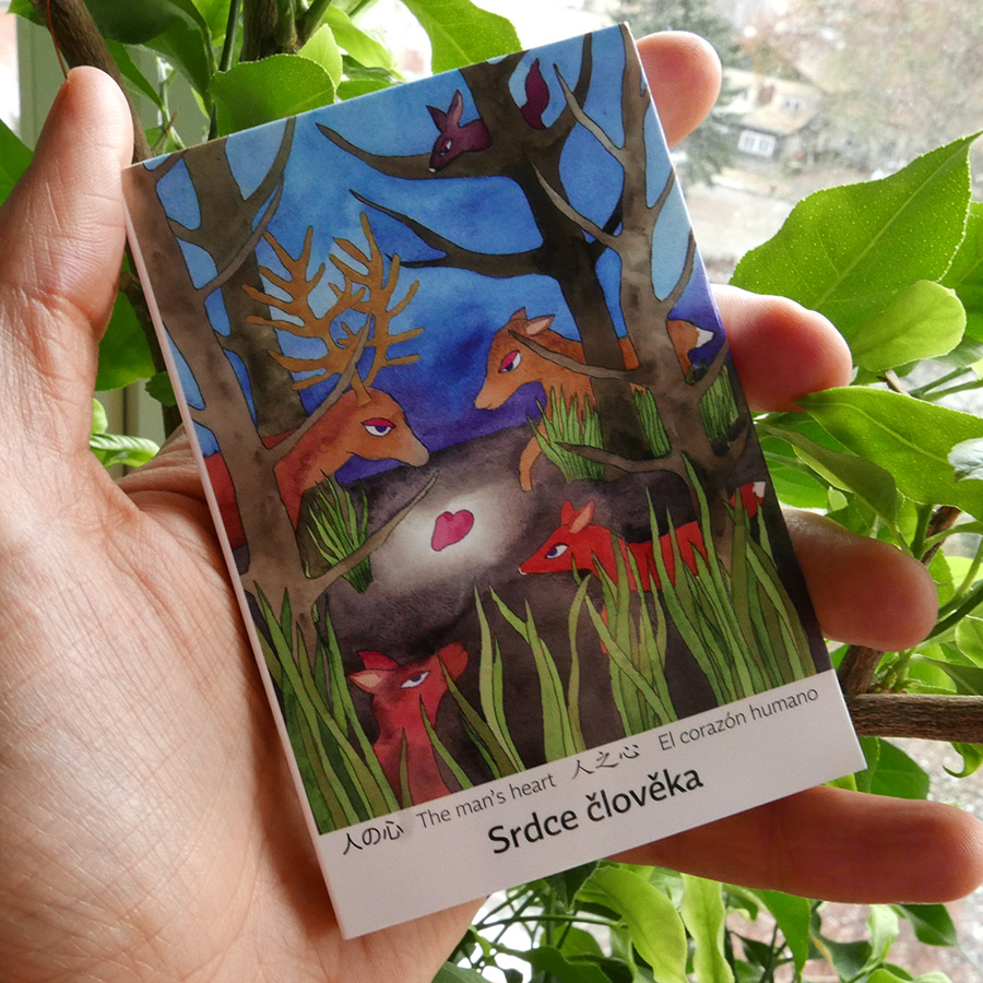 Komiksové akvarelové leporelo obsahuje kromě českého textu také anglický, španělský, japonský a čínský překlad.